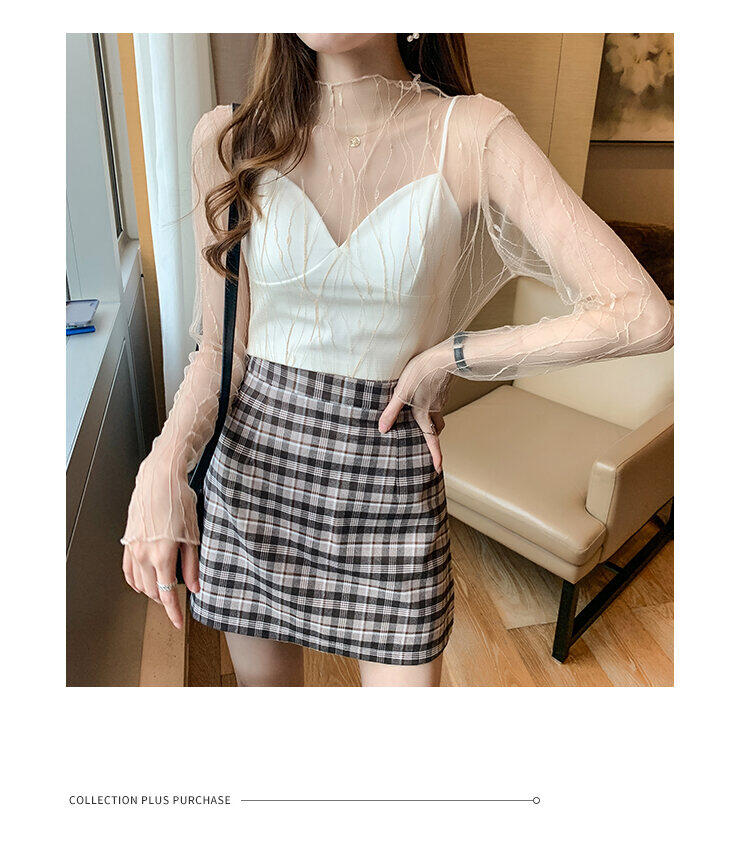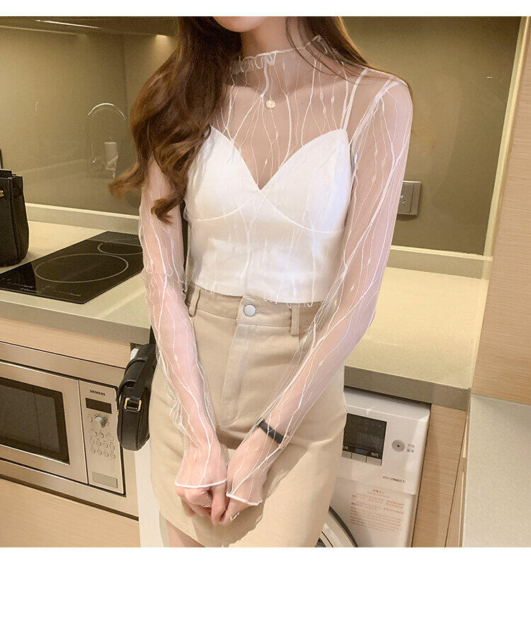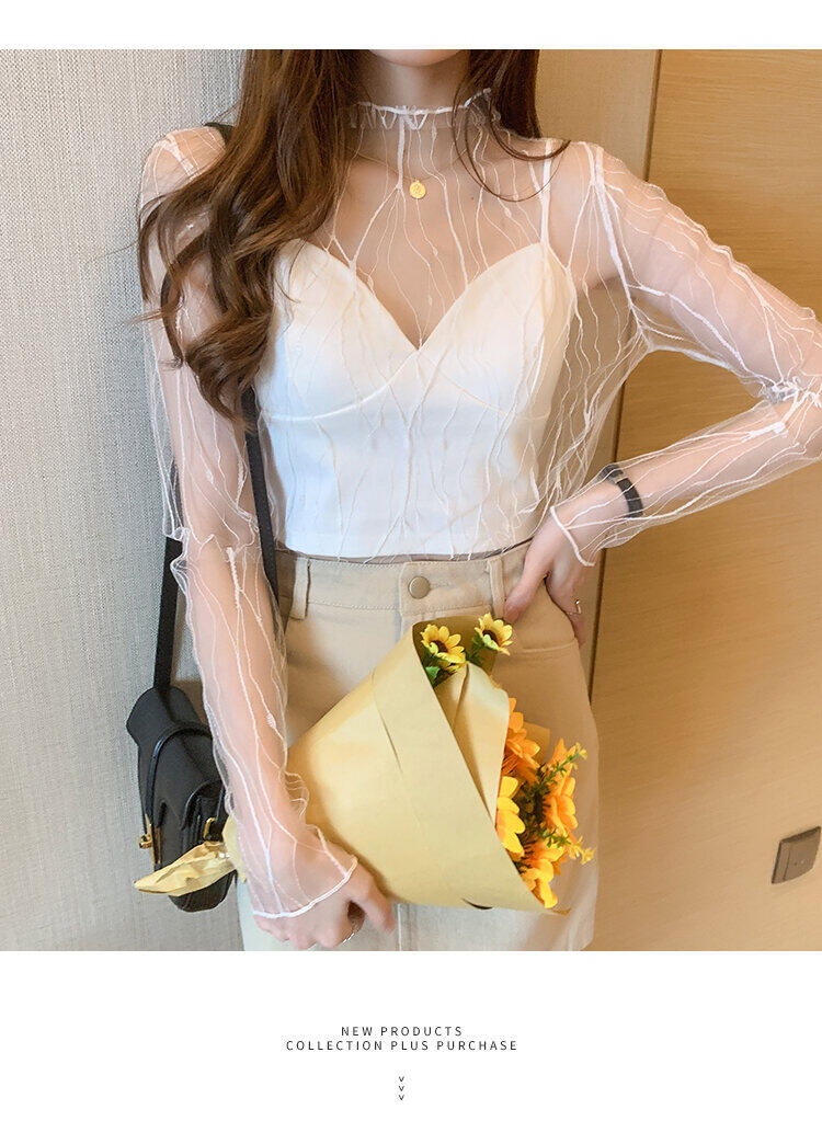 春秋简约长袖仙子透视蕾丝网眼